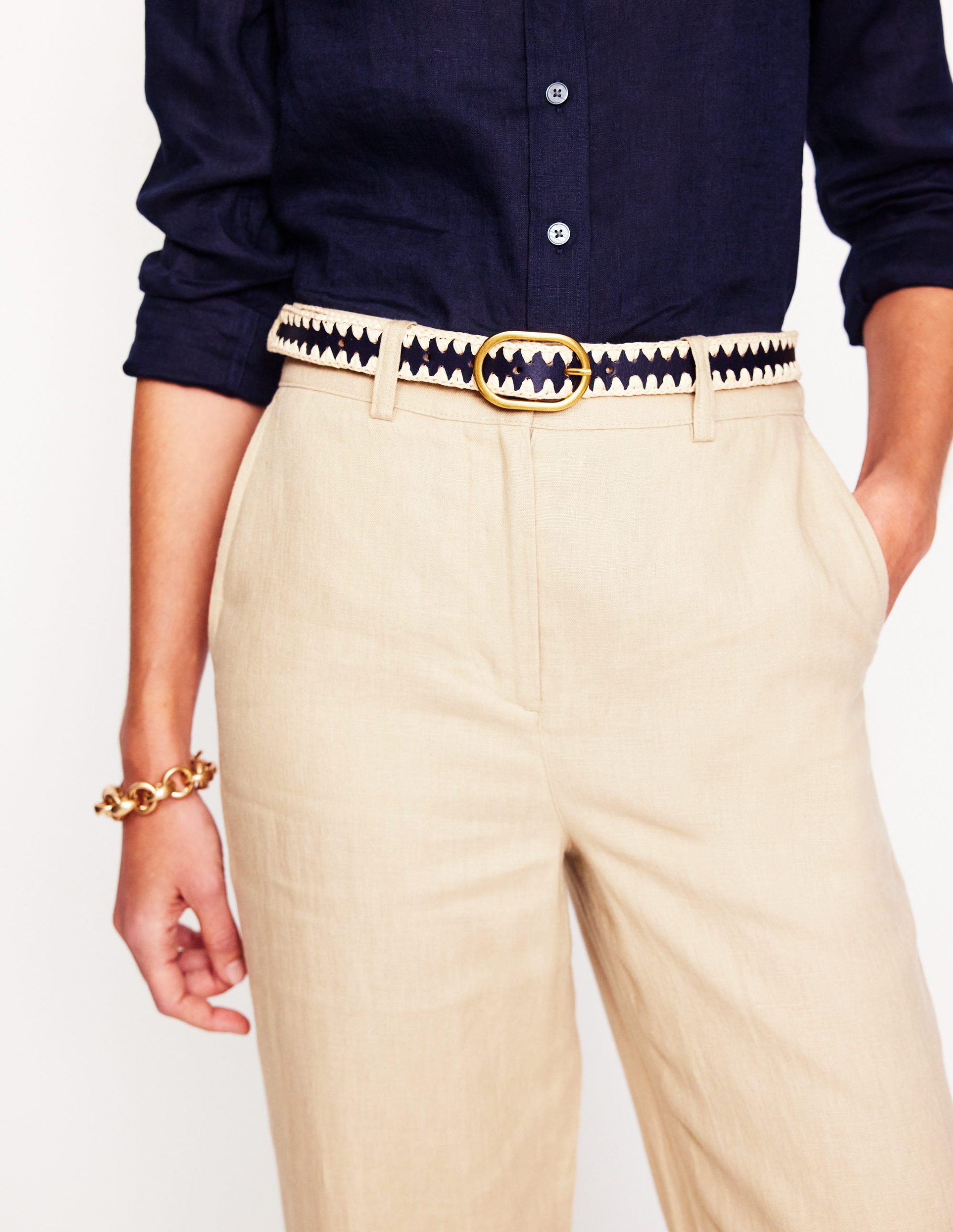 Woven from raffia with contrasting whipstitch trims, this belt will add a bohemian edge to your look. Showcase the round-buckle fastening by cinching it over a flowy dress.